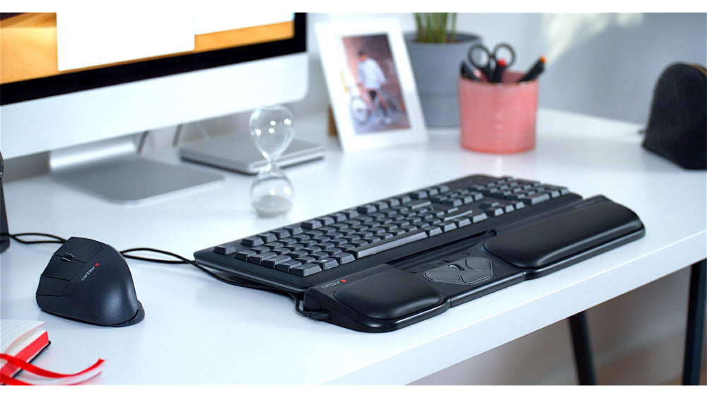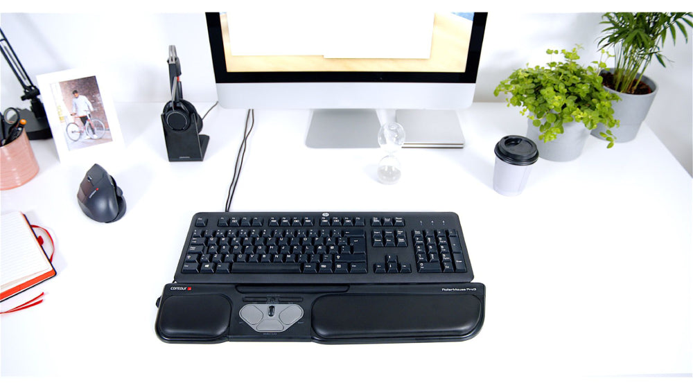RollerMouse Pro3, unlike a traditional mouse, sits in front of your keyboard instead of to the left or right. This placement eliminates the need for reaching for the mouse and will greatly reduce unnecessary muscle activity in your arms, shoulders, and neck.