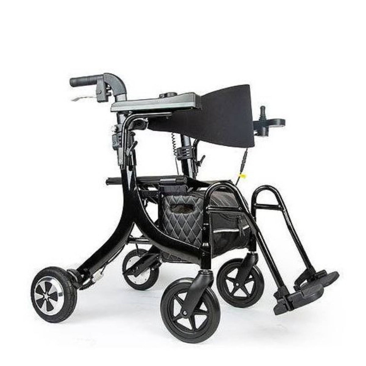 The E-Traveller Evo is a multi-functional mobility solution that can be used as an electric wheelchair, rollator and assisted wheelchair. It features a joystick controller for operation while seated, as well as a rear attendant controller when assisted. Other features include 3-gear resistance, uphill assistance, smart brake anti-fall technology, adjustable backrest height, adjustable handle height, swing-away leg rests and solid puncture-proof tyres.