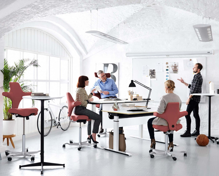 No other task chair is so well adapted to sitting at different heights. The flexible height ranges of the HÅG Capisco and the HÅG Capisco Puls make it easy to shift between sitting, standing and perching. Frequently varying your position this way provides a unique alternative to changing between sitting, standing and perching positions. By moving more you will feel energised and therefore more focused on the task at hand. This is also the perfect way to reduce fatigue that is often associated with standing desks.
