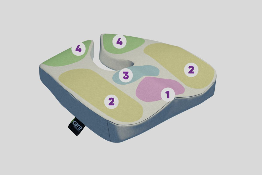 1. Pommel ridge to reduce adduction risk 2. Moulded thigh area reducing pressure 3. Coccyx cutout to reduce pressure on tailbone area 4. Extended lower back support