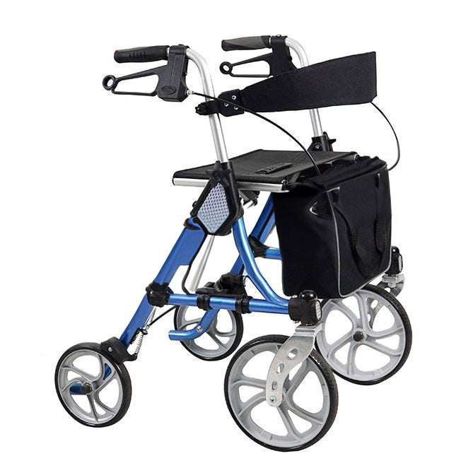 The Hi-Roller Rollator offers a foldable, lightweight and strong aluminium rollator. The rollator also has the ability to act as a seat when you are in need of a little rest. The lockable wheels ensure the rollator won't move when sitting on the seat. Other handy features include a zip-up front storage bag and puncture-proof tyres.