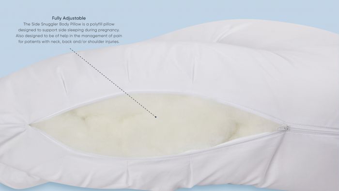 Experience better side sleeping support with our Side Snuggler Pillow. The perfect pillow for, side sleepers who require positioning support. Designed to encourage side sleeping, this pillow provides cushioning arms to support the front and back of your body, preventing rolling onto your back. You can also adjust the polyfill inner material for more personalised comfort. Enjoy the benefits of improved spine alignment and reduced snoring.