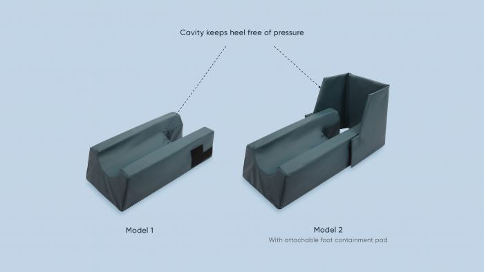 Heels rest weightless and without friction in the open chamber to prevent or manage heel pressure ulcers.