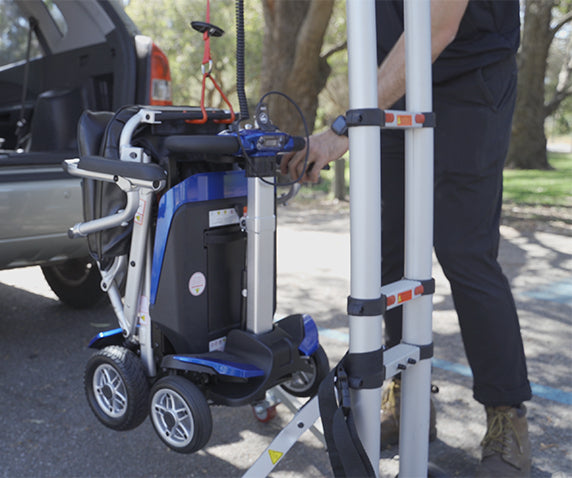 The Solax Portable Electric Hoist helps safely lift your travel scooter in and out of the boot of your car. Made from light telescopic aluminium, this hoist weighs only 13kg which means it can be easily lifted in and out of your vehicle. The hoist is powered by your scooter’s battery, making this accessory the perfect companion for your Solax. An external battery pack is also available.